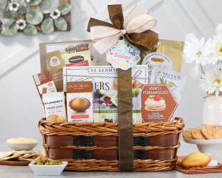 Send a little sunshine their way with this thoughtful gift basket! Inside, they'll find everything to lift their spirits, including smoked Gouda cheese spread, sesame crackers, Saint Germain puff pastries, vanilla sea salt caramels, Red Thread chocolate chip cookies, Mandy's dark chocolate cookie thins, and more.