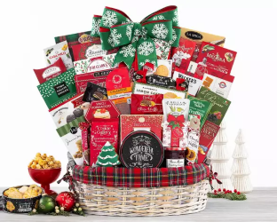 A bountiful holiday gift basket perfect for a large crowd. Features Calabrese salami, sesame crackers, strawberry preserves, vanilla fudge with sea salt, chocolate brownies, lemon cakes, Lindt milk chocolate truffles, Red Rocker Rocking Chair snack mix, rosemary crackers, smoked Gouda cheese spread, French butter cookies, olives, chocolate waffle cookies, hazelnut dark chocolate and so much more.