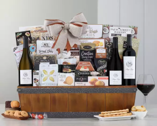 A trio of Stags' Leap Winery premium wines paired with an appetizing assortment of gourmet foods. Features fruity Cabernet, tropical Chardonnay and intense Petite Syrah arrive with a selection of coconut cookies, Belgian truffles, paprika garlic crips, smoked Gouda cheese spread, Lindt milk chocolate truffles, basil thyme artichoke snacks, cranberry waffle cookies and much more.